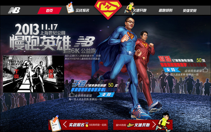 核心提示:URL: http://newbalance.renren.com 跑步或許不能救世,但New Balance相信跑步能讓你我化身英雄,傳遞給更多人正能量! 近日,New Balance攜手明星為姚基金希望小學(xué)的孩子們跑出一場(chǎng)慈善盛舉,強(qiáng)勢(shì)推出慢跑英雄聯(lián)盟線上線下整合營(yíng)銷(xiāo)攻勢(shì)。 作為其互動(dòng)營(yíng)銷(xiāo)代