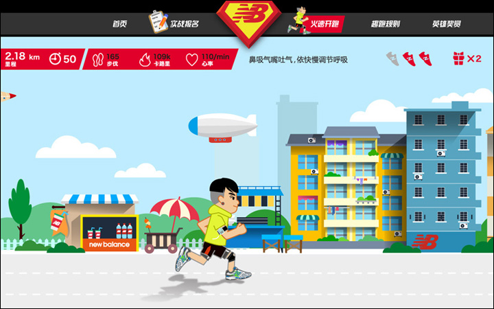 作為其互動(dòng)營(yíng)銷(xiāo)代理商的Leadinfo(立特整合營(yíng)銷(xiāo)傳播機(jī)構(gòu))便以英雄扮演的趣味方式為New Balance創(chuàng)意了一款在線趣跑游戲http://newbalance.renren.com,用戶(hù)只需用人人網(wǎng)賬號(hào)登錄,即可選擇卡通角色邊跑邊體驗(yàn)身為英雄的快感。