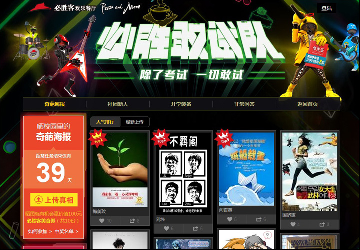 必勝客敢試隊——除了考試,一切敢試!曬校園里的奇葩海報,曬社團(tuán)新人照片(萌帥呆囧),曬開學(xué)裝備,曬個人學(xué)生證,在這里沒有你想不到的,只有你不敢試的。參加活動,便有機(jī)會獲得必勝客美食券,鼓起勇氣,召喚小伙伴一起來試吧!
