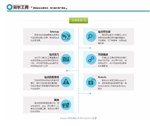 站長可以通過工具區(qū)提供的死鏈推送、站點(diǎn)索引量查詢、站點(diǎn)抓取報錯查詢、robots工具、站點(diǎn)壓力反饋和網(wǎng)站安全監(jiān)測等功能,減輕網(wǎng)站服務(wù)器壓力,提升網(wǎng)頁抓取效率和質(zhì)量,減少網(wǎng)站安全隱患,從而實(shí)現(xiàn)網(wǎng)站的精細(xì)化運(yùn)營。資料區(qū)提供了搜索優(yōu)化案例、工具使用說明、網(wǎng)站運(yùn)營經(jīng)驗(yàn)文檔,幫助站長汲取網(wǎng)站運(yùn)營經(jīng)驗(yàn)、夯實(shí)理論基礎(chǔ);站長社區(qū)的則是站長間溝通和分享的平臺,既會定期組織交流活動和分享討論,,有利于站長們?nèi)¢L補(bǔ)短提升網(wǎng)站運(yùn)作技巧,解決站長面臨的典型問題。