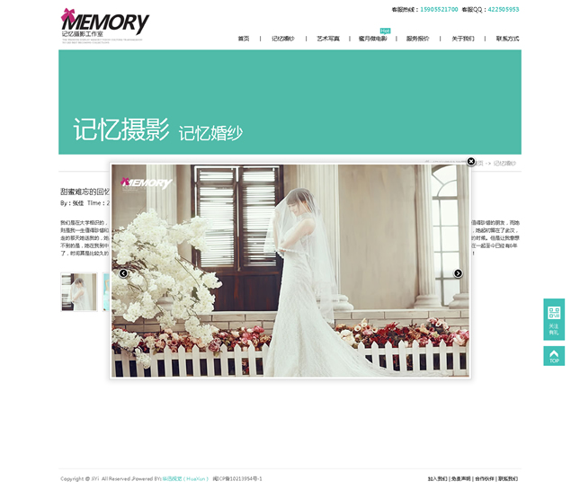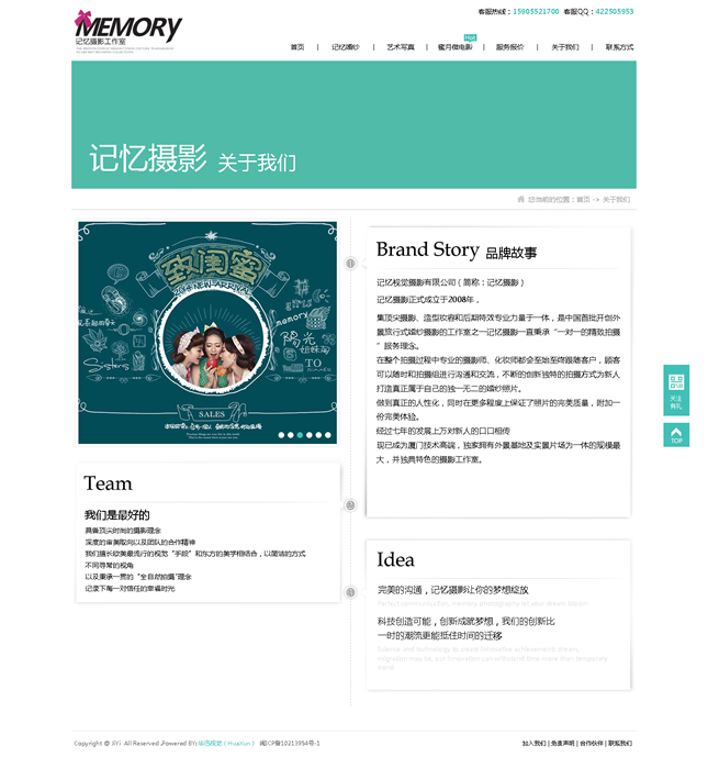 記憶視覺(jué)攝影有限公司(簡(jiǎn)稱(chēng):記憶攝影)記憶攝影正式成立于2008年,集頂尖攝影、造型妝容和后期特效專(zhuān)業(yè)力量于一體,是中國(guó)首批開(kāi)創(chuàng)外景旅行式婚紗攝影的工作室之一記憶攝影一直秉承“一對(duì)一的精致拍攝”服務(wù)理念。在整個(gè)拍攝過(guò)程中專(zhuān)業(yè)的攝影師、化妝師都會(huì)至始至終跟隨客戶(hù),顧客可以隨時(shí)和拍攝組進(jìn)行溝通和交流,不斷的創(chuàng)新獨(dú)特的拍攝方式為新人打造真正屬于自己的獨(dú)一無(wú)二的婚紗照片。做到真正的人性化,同時(shí)在更多程度上保證了照片的完美質(zhì)量,附加一份完美體驗(yàn)。